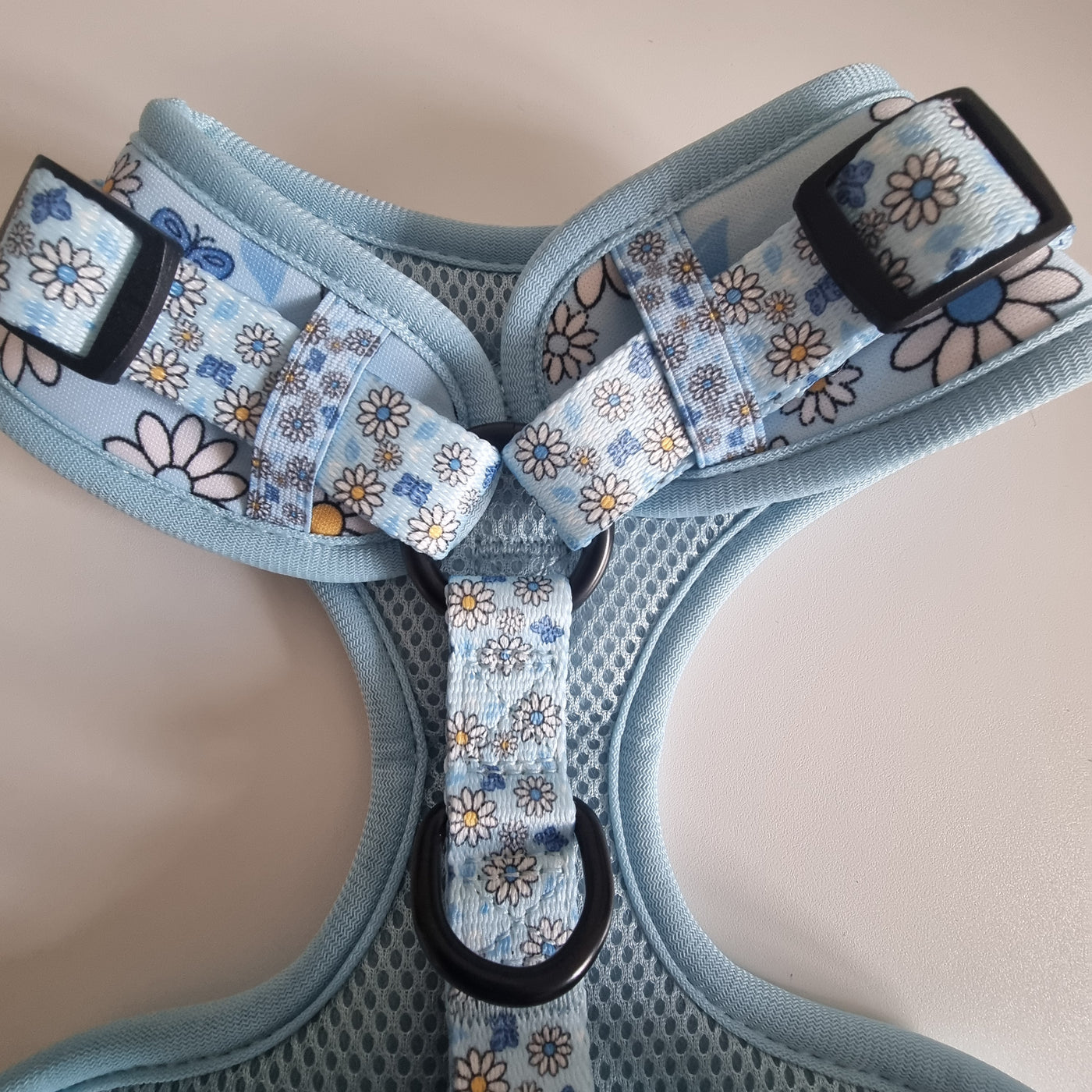 Fresh and calming, Pups A Daisy Blue features a cool floral design perfect for everyday adventures. This adjustable dog harness is lightweight, secure and designed for comfort on every walk.